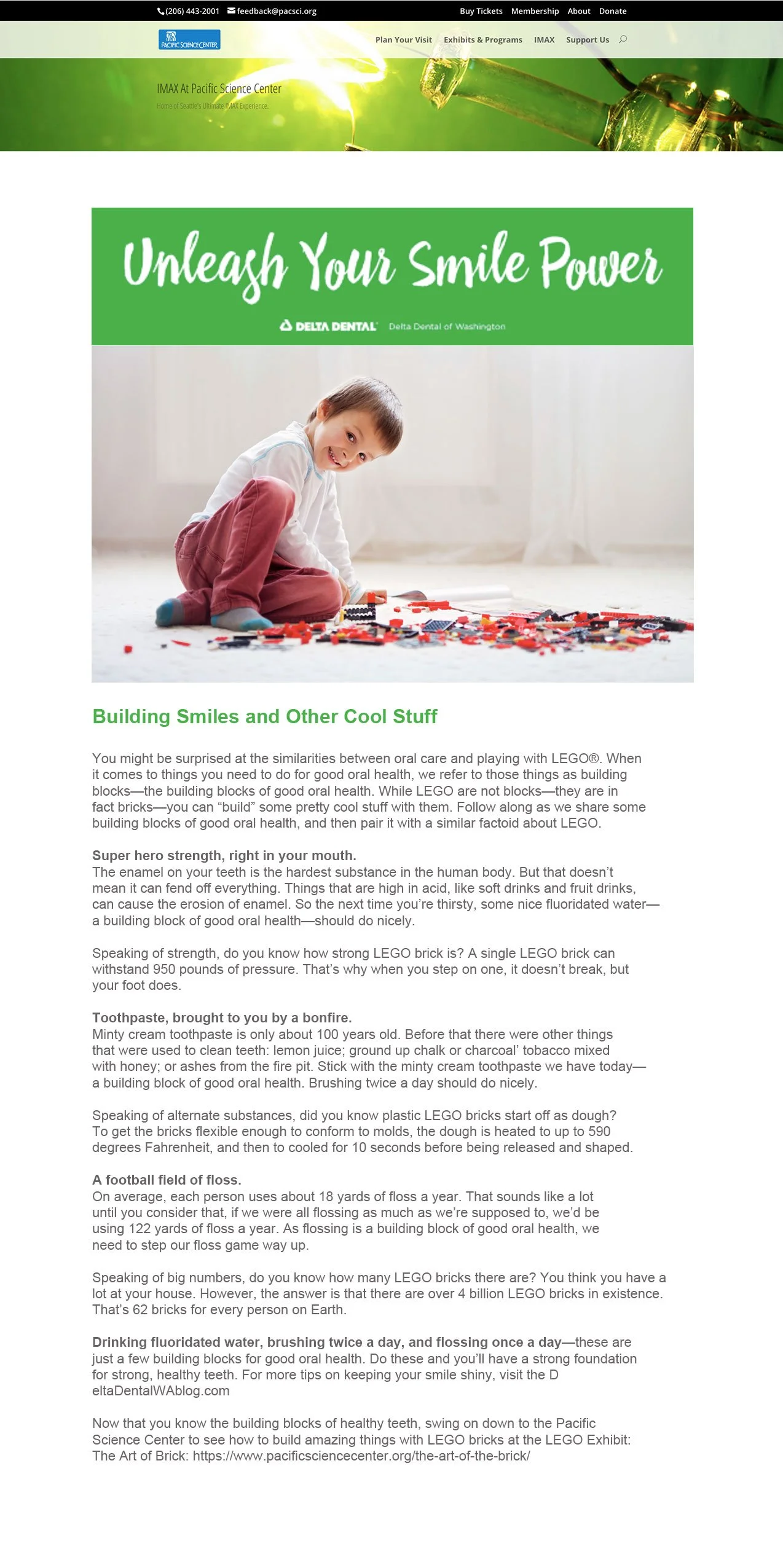 Solution: We aligned the building of healthy teeth with the building of items with LEGO® bricks to make oral care fun. We also cross-promoted the Art of Brick exhibit at the Pacific Science Center.
